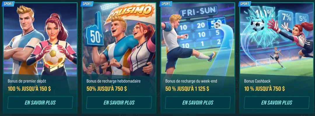 - Bonus de Bienvenue Sportif : 100% jusqu'à 100 €